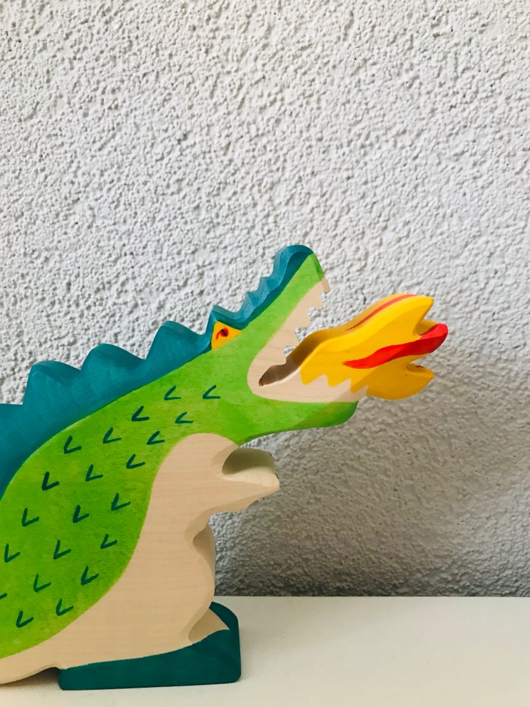 Maar zo spannend maken we het bij ons thuis nog niet. Wij vinden de verhalen nog een beetje te heftig voor onze 4-jarige…Zeker heeft bij ons de draak ook een plekje op de seizoenstafel, maar hij verdwijnt ook net zo makkelijk tussen de paarden en koeien bij de speelgoedboerderij.