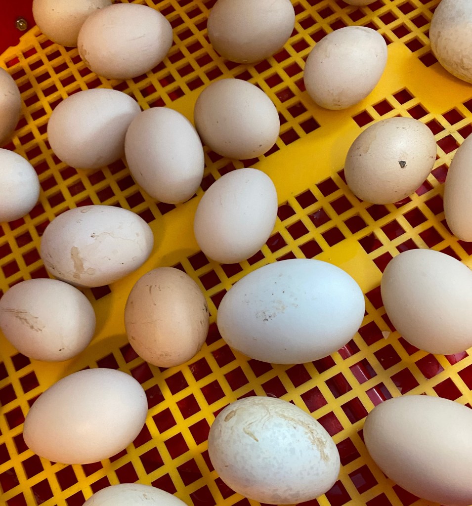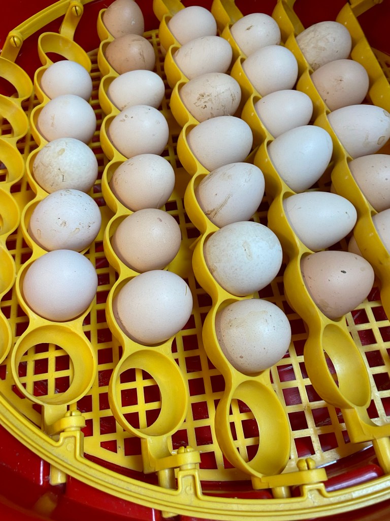 Deze eieren legden we in het rekje van de broedmachine. Hierin worden de eieren regelmatig gedraaid wat zorgt dat de kuikentjes goed kunnen groeien en zich goed ontwikkelen. De luchtvochtigheid van de broedmachine moet rond 50-55% zijn en de temperatuur 37,5 graden.