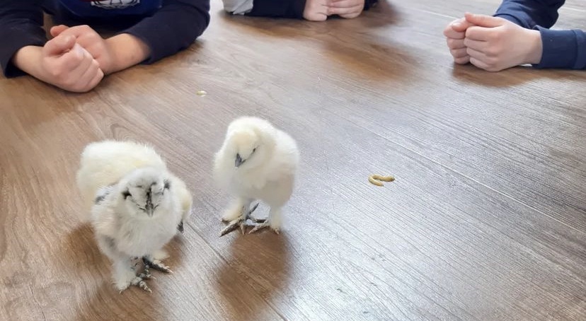 Pas wanneer ze helemaal opgedroogd zijn mogen ze verplaatst worden. Op deze plek moet dan een warmtelamp of warmteplaat geplaatst zijn. Ook hebben ze water en kuiken-meel nodig. En een laagje zaagsel. Dit moet regelmatig ververst worden. Natuurlijk om hygiënische redenen, maar de kuikentjes kunnen er ook een behoorlijke zooi van maken;)