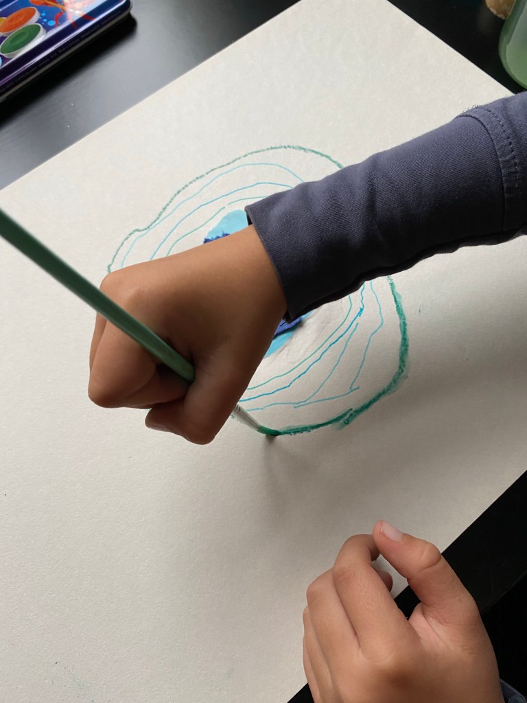 3. Dan volg je die zelfde lijn met pastelkrijt. Daarna pak je een kwast en dip die in wat water. Ga daarmee over de lijn van pastelkrijt. Dit geeft een mooi effect.